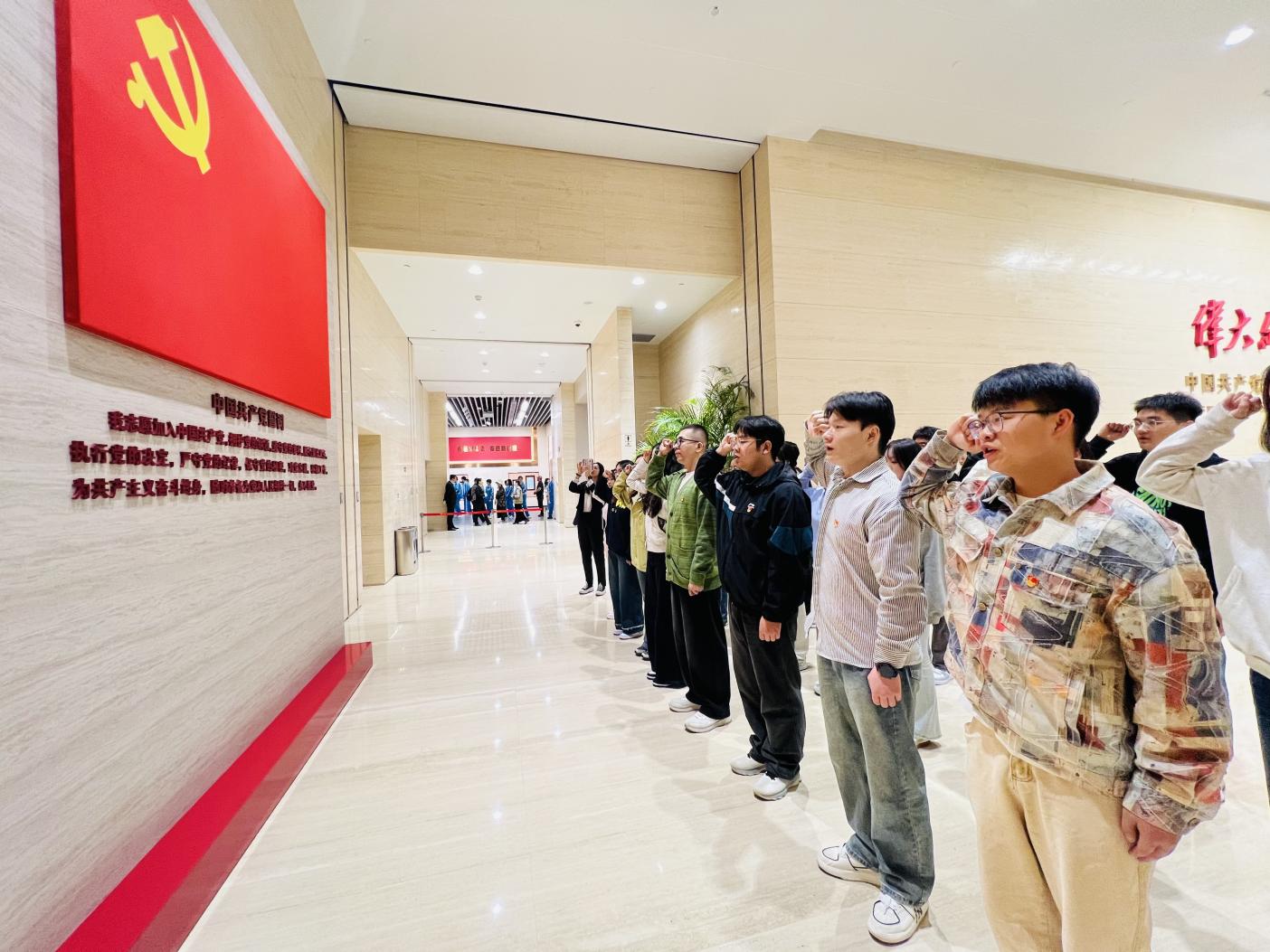 在参观过程中,党员们以党小组为单位分工协作。第一党小组负责梳理纪念馆的展览框架,第二党小组重点研究镇馆之宝的历史内涵,第三党小组则结合展陈内容撰写初心感悟。参观尾声,在支部书记王喆的带领下,全体党员面向党旗重温入党誓词。