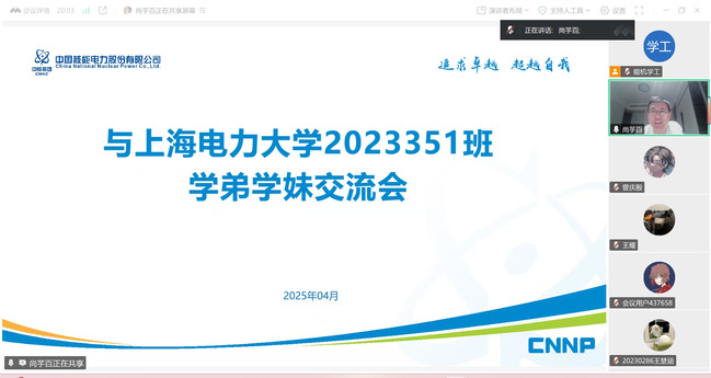 为深化校企协同育人,充分发挥校友职业引领作用,助力学子把握核能行业前沿、规划职业发展,进一步拓宽行业认知边界、锚定人生航向,4月24日,beat365中文官方网站2023351班通过腾讯会议平台举办“核聚英才·共筑未来”校友职业成长导师交流会。2023351班校友职业成长导师、2008届热能与动力工程专业校友、福建福清核电有限公司运行值长尚芋百担任主讲嘉宾,与核工程与核技术专业学子共叙行业脉搏,共绘职业蓝图,会议由辅导员仝晶晶主持。