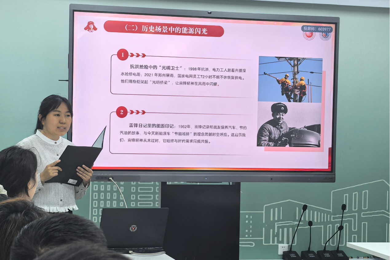 第二期活动紧扣“学雷锋”时代主题,宣讲团成员刘欣以《传承雷锋精神 争做能源先锋——新时代青年的使命担当》为题,从能源行业视角切入,通过“雷锋日记”经典片段、当代“能源工匠”案例等鲜活素材,多维度解析雷锋精神“忠诚于党、奉献人民、爱岗敬业”的核心内涵。特别结合“双碳”目标背景,引导现场学生共同探讨新时代青年如何将雷锋精神融入绿色技术创新、能源结构转型等实践,号召青年学子以“螺丝钉”的钻研精神投身国家战略需求,争做新时代“能源先锋”。