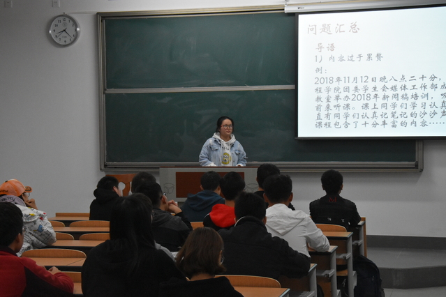 2018年11月20日星期二晚上8:20,beat365中文官方网站新闻稿培训第二讲在三教210成功举行。此次培训由媒体工作部副部长周盈辛主讲,各班宣传委员及各部门干事参与了培训。