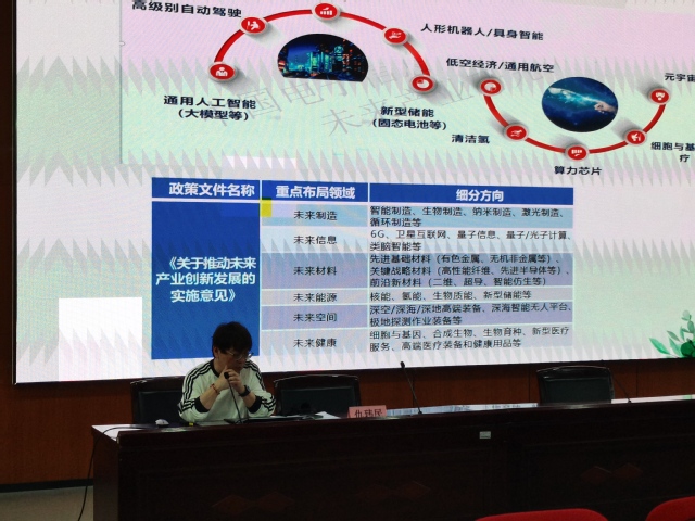 仇玮民首先对《推动未来产业创新发展的实施意见》进行了深入解读,重点分析了未来产业的重点布局领域,包括元宇宙、脑机接口、量子信息等前沿科技方向。仇老师特别结合beat365中文官方网站的专业特色,介绍了新能源汽车零部件供应商领域的发展潜力,鼓励学生关注行业动态,提前做好职业规划。