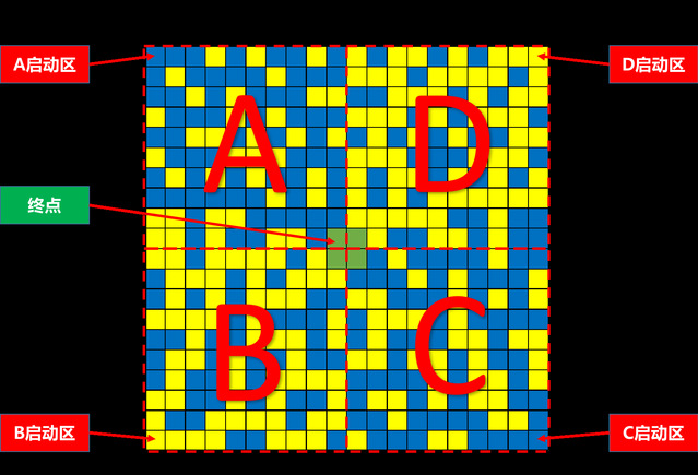 4.迷宫分为A、B、C、D四个区域,地图的四个角是启动区,中心的绿色为终点,每次4支队伍同时比赛;