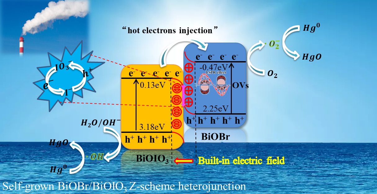 电厂烟气中含有汞、砷等大量重金属,危害人类健康和生态环境,其排放控制日益引起重视。该ESI论文采用溶剂热合成法,将BiOIO3纳米片原位自生长在BiOBr微球上,构建形成了富氧空位的三维分级BiOBr/BiOIO3复合Z型异质结光催化剂,对光催化氧化烟气中重金属具有良好的效果。这项工作通过Z型异质结和氧空位的协同效应不仅能够促进电子空穴对的分离传输效率,还能有效促进模拟烟气中分子氧活化生成更多的活性氧物种,为烟气净化及光催化研究提供了新的思路。
