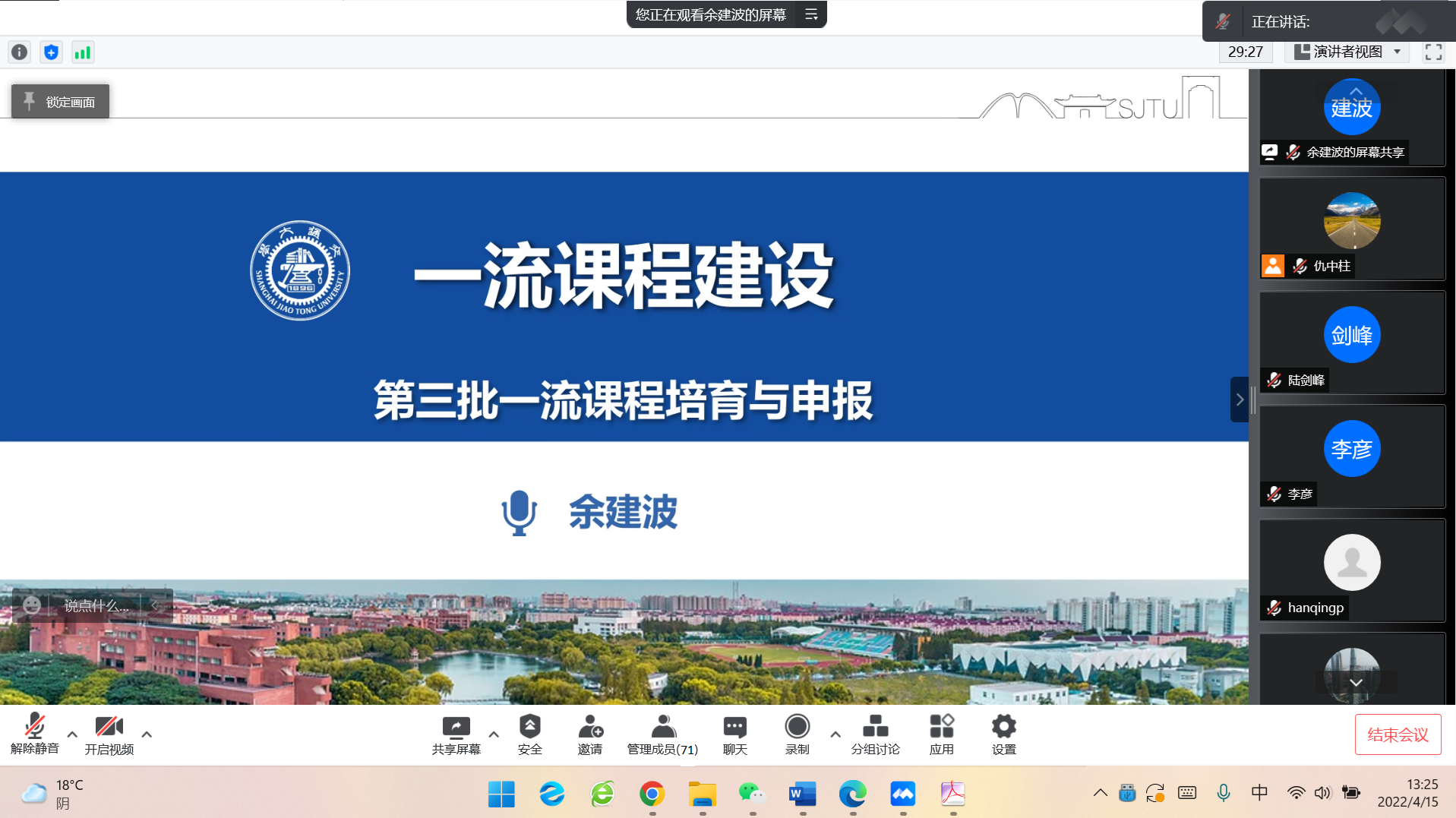 2022年4月15日下午,beat365中文官方网站线上召开课程建设专题会,会上特邀上海交通大学教务处在线课程建设负责人余建波老师做了“一流课程建设”线上专家报告。beat365中文官方网站全体教师参加了专题会,会议由仇中柱副院长主持。