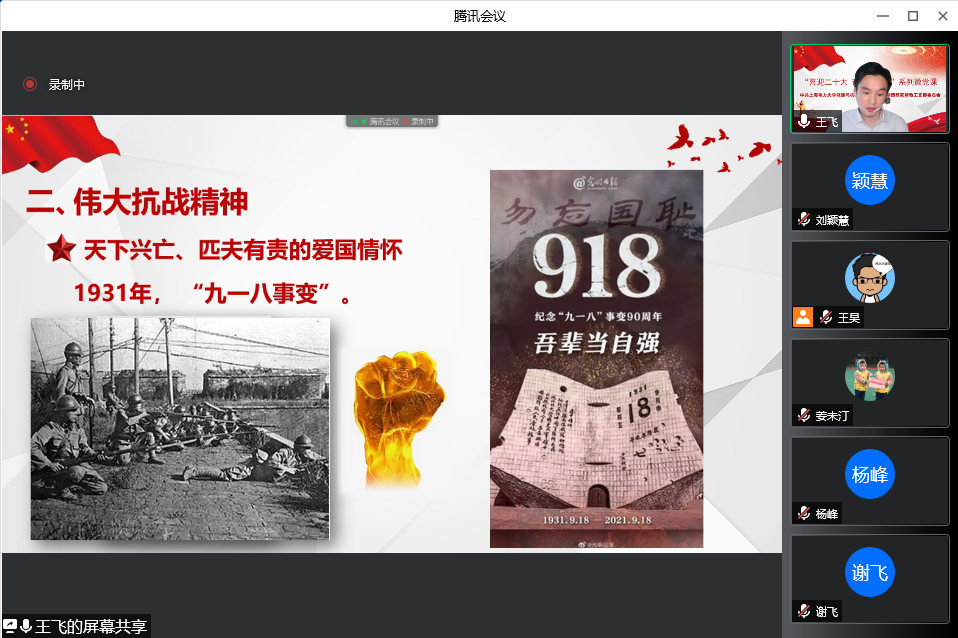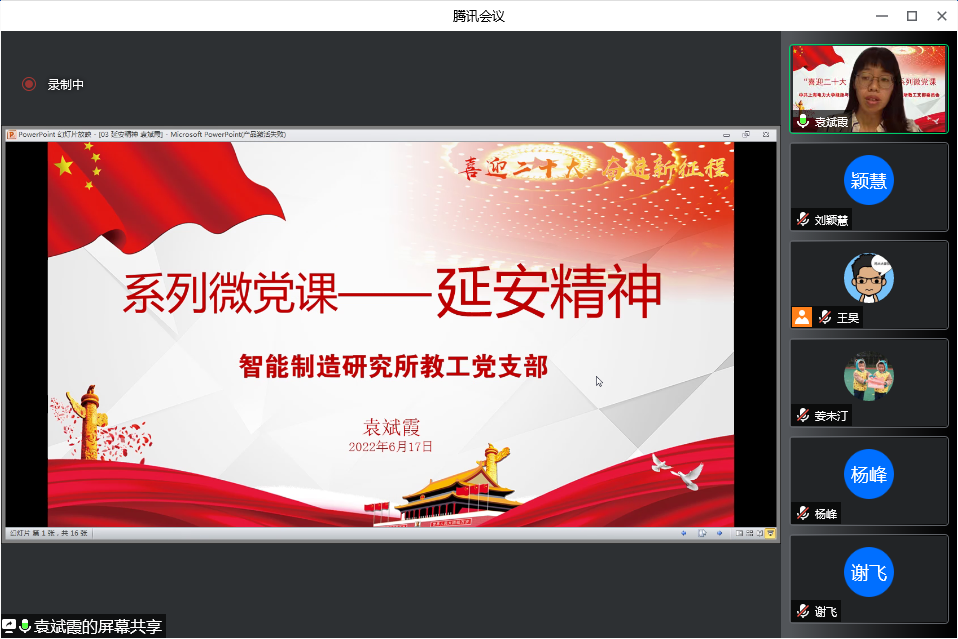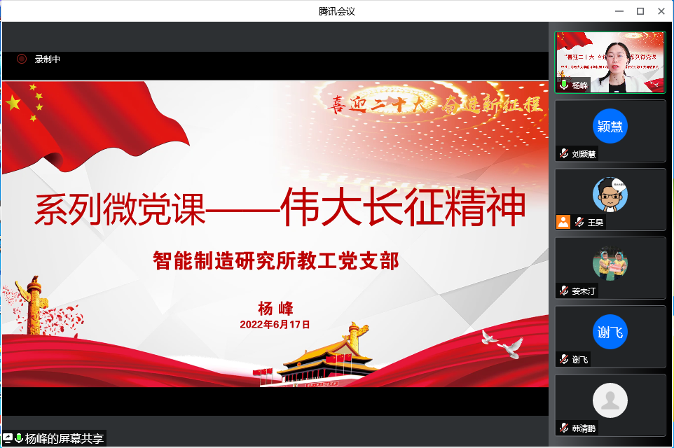 此次活动是由智能制造研究所教工党支部筹划发起的。该支部作为上海市教卫党委示范点建设党支部,在实际工作开展中,探索总结出“党建+N”的工作模式。在完善制度型建设的基础上,为进一步推进创新型、学习型、示范型支部建设,组织筹划了“喜迎二十大、奋进新征程”系列微党课以及“共读一本书”系列活动。系列微党课以伟大建党精神入手,按照新民主主义革命时期、社会主义革命和建设时期、改革开放和社会主义现代化建设时期、中国特色社会主义新时代四个篇章的顺序进行每月微党课展示。