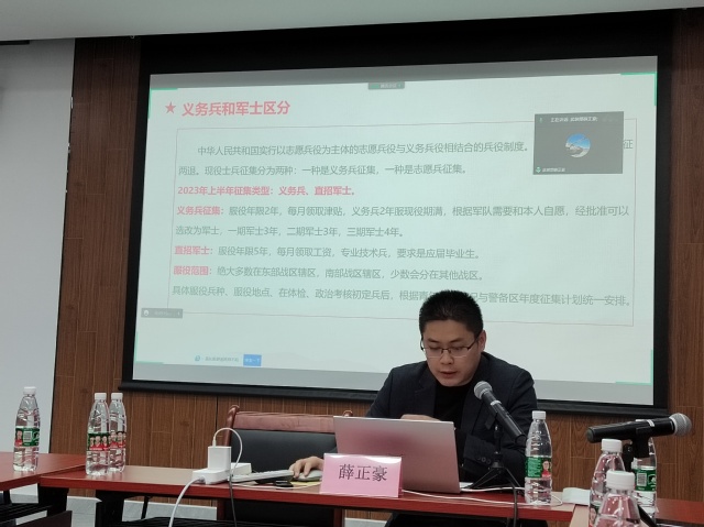 首先,薛正豪老师从国家政策法规方面介绍了征兵入伍的重要意义,依照法律服兵役和参加民兵组织是中华人民共和国公民的光荣义务。我校历年都十分重视征兵工作,十五年来已为部队输送超过800余人次的优秀大学生兵源,其中诸多学子已成长为优秀的军士或者军官,扎根基层,报效祖国,建功立业。
