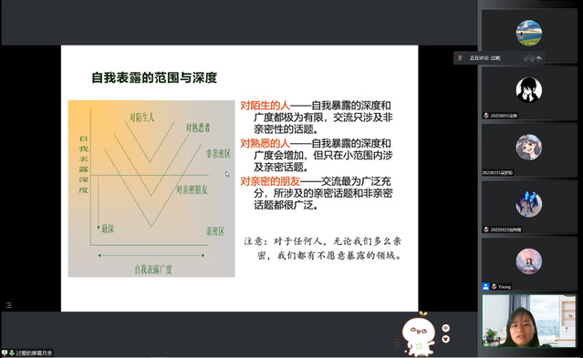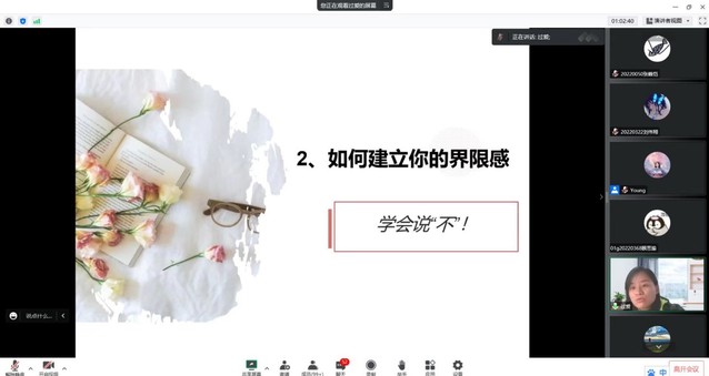 为有效引导新生优化个性心理品质、提高心理调适能力,构建良好可持续的人际交往关系,尽快完成大学生活的调整和适应,121613:30,beat365中文官方网站组织全院新生齐聚云端,开展了一场主题为“大学生的人际沟通”的专题讲座,讲座由校心理健康教育中心专职心理教师过爱主讲。