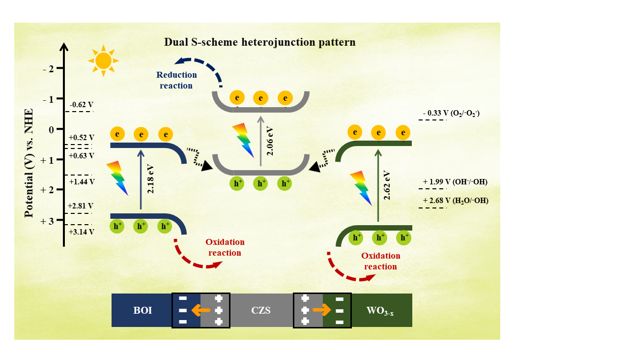 苯酚作为受污染水体的一种有毒物质,其在水中降解速度缓慢,排放到环境中对人类的生存和发展以及整个生物圈都造成了干扰和威胁。此外,苯酚的处理难度还比较大。传统的处理苯酚水的方法有很多,但存在着各种弊端。光催化降解废水技术是运用太阳能处理水污染问题的新兴技术,其可将污染物高效的矿化为CO2和H2O,与其他矿物(如无害盐类和无机酸等小分子)作为最终产物。然而目前,半导体的光催化性能容易受到光学吸收和光生电荷分离的影响。鉴于此,开发一种高效稳定的新型光催化剂来降解苯酚显得至关重要。最近在国际顶刊《Applied Catalysis B: Environmental》发表的研究论文,提出了一种全光谱响应的双S型异质结Bi7O9I3/Cd0.5Zn0.5S QDs/WO3-x用于光催化降解苯酚,对苯酚的降解效率达到了100%。研究表明WO3-x作为光敏剂提高了复合物的光响应能力,使得复合材料的光谱响应范围扩展到全光谱,极大促进了光生电荷的产生。另外,由于构建了双S型异质结形式的多通道转移方式极大的促进了光生空穴-电子的分离,从而提高了降解效率。本研究可以用于净化水污染,并且对构建高性能全光谱响应的双S型异质结具有重要的参考价值。