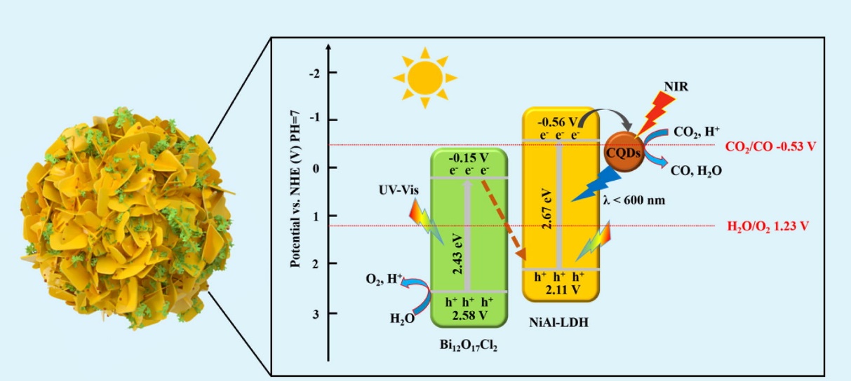 围绕光催化应用应用于清洁能源领域,研究团队在环境科学领域国际著名期刊《Applied Catalysis B: Environmental》(318(2022)121839,IF: 24.319)上发表题为“A novel double S-scheme photocatalyst Bi7O9I3/Cd0.5Zn0.5S QDs/WO3-x with efficient full-spectrum-induced phenol photodegradation”的研究论文;在材料化学领域国际著名期刊《Journal of Materials Chemistry A》(10(2022)7604-7625,IF: 14.511)上发表题为“Recent progress on van der Waals heterojunctions applied in photocatalysis”的综述论文;在绿色能源国际著名期刊《ACS Sustainable Chemistry & Engineering》(10(2022)11143-11153,IF:9.224)上发表题为“Construction of Carbon Dots Modified g-C3N4/BiOIO3 Z-Scheme heterojunction for boosting photocatalytic CO2 reduction under full spectrum light”的研究论文;在化学领域国际著名期刊《Journal of Colloid and Interface Science》(627(2022)343-354,IF:9.965)上发表题为“Carbon quantum dots-modified Z-scheme Bi12O17Cl2/NiAl-LDH for significantly boosting photocatalytic CO2 reduction”的研究论文;在纳米科学技术国际著名期刊《Nanoscale》(14(2022)16033,IF: 8.307)上发表题为“A review on TiO2-x-based materials for photocatalytic CO2 reduction”、“Progress and perspectives on 1D nanostructured catalysts applied in photo(electro)catalytic reduction of CO2”的综述论文等系列论文。前两篇论文第一作者为2020级硕士研究生陈欣,其余论文第一作者分别为2020级硕士研究生胡杏、毕哲旭、王娟和2021级硕士研究生李楚凡,郭瑞堂教授和潘卫国教授为上述论文的通讯作者。