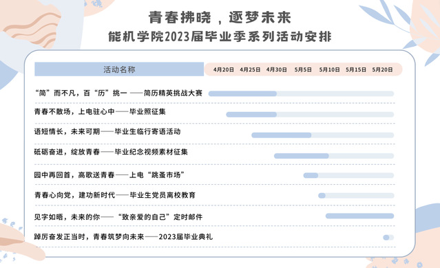 恍然间,四年的时光苒苒而过,2023届能机学子也迎来了属于自己的毕业季。在大四学子们启程之际,学院筹备了青春拂晓,逐梦未来毕业季系列活动,希望能给你们留下一个美好的回忆,感受到母校的温暖和关怀。