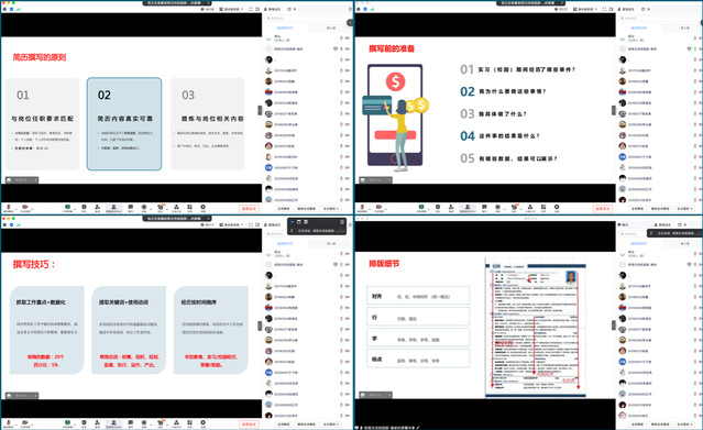谢亲以HR视角给大家介绍了简历筛选的逻辑,从“简历撰写的原则”、“撰写前的准备”、“撰写技巧”、“排版细节”等多方面详细阐述了如何制作一份优秀的简历,让学生们更加直观清晰地了解到优秀简历的制作方法。通过对几份不同风格的简历对比,与大家一起分析了这些简历的亮点和不足,并指出毕业生简历制作的常见误区。