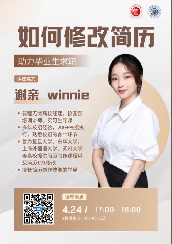 为进一步帮助学生明晰职业规划、提升就业认知与求职技巧,强化学生综合素质,beat365中文官方网站于4月24日特邀前程无忧高校经理、校园部培训讲师谢亲开展简历撰写的专题指导,学院2024届全体毕业生和2023届未就业毕业生在线观看。