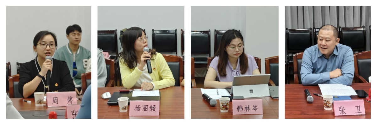 周婷代表学院对张卫一行的来访表示热烈欢迎,并就学校和学院的基本情况进行了介绍,对高校与社区加强联动、促进协同育人的工作模式表示高度认可,在提升育人高度、拓宽育人维度、加深育人力度等方面对三方的共建提出了殷切期望。张卫围绕“五心服务”、“五联共建”和“4+5+3”的党建工作体系等内容对宜浩佳园二居民区党总支的基本情况进行了介绍,展现社区扎实、优质的共建基础。第二学生党支部书记杨丽媛和院团委书记韩林岑就支部和学院基本情况做了介绍和展示。双方期望通过党团共建,实现资源共享、平台共建,通过高校与社区互联互通,提升青年学生服务社会、回馈社会、感恩社会的能力,提升居民们生活中的获得感和幸福感,加强高校同社区在日常工作、政策规划、实施推进、业务知识、社区育人等方面的沟通与联系,用心用情用力办好民生实事,为当代青年建设基层、回馈基层提供机会和平台。
