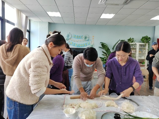 一大早,老师们就聚集在温馨美好的教工之家里,在大家的欢声笑语中,beat365中文官方网站一年一度的包饺子活动火热展开。今年的所有饺子馅都是现做现调,芹菜猪肉、羊肉大葱、胡萝卜鸡蛋、韭菜虾仁等,丰富多样,远远闻着就香味扑鼻。现场活动中,各位老师分工合作,互帮互教,有的擀皮、有的揪面团、有的包馅儿,各显身手。短短的时间里,一排排独具个性的饺子很快就摆满了一个个餐盘,大家体验着协作的乐趣,感受着冬日的温情。