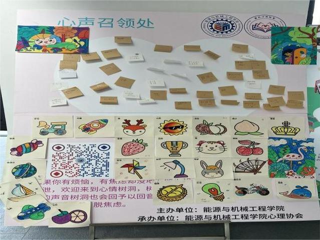 活动现场,在精心布置的摊位上,4个充满创意的小活动及能机心协精美的定制周边吸引了大量同学参与活动。在趣味涂鸦摊位上,参与者收到画纸后在上面绘画涂鸦,同学们用蜡笔涂色,完成后贴在大背景板上,组成了一幅大画作。心灵奇旅摊位上,参与者在游戏中会收到一张小纸片,由参与者随心写画,随后收集在大纸箱“漂流瓶里”,同学们写下的内容既有对未来的憧憬,也有对当下的期许。