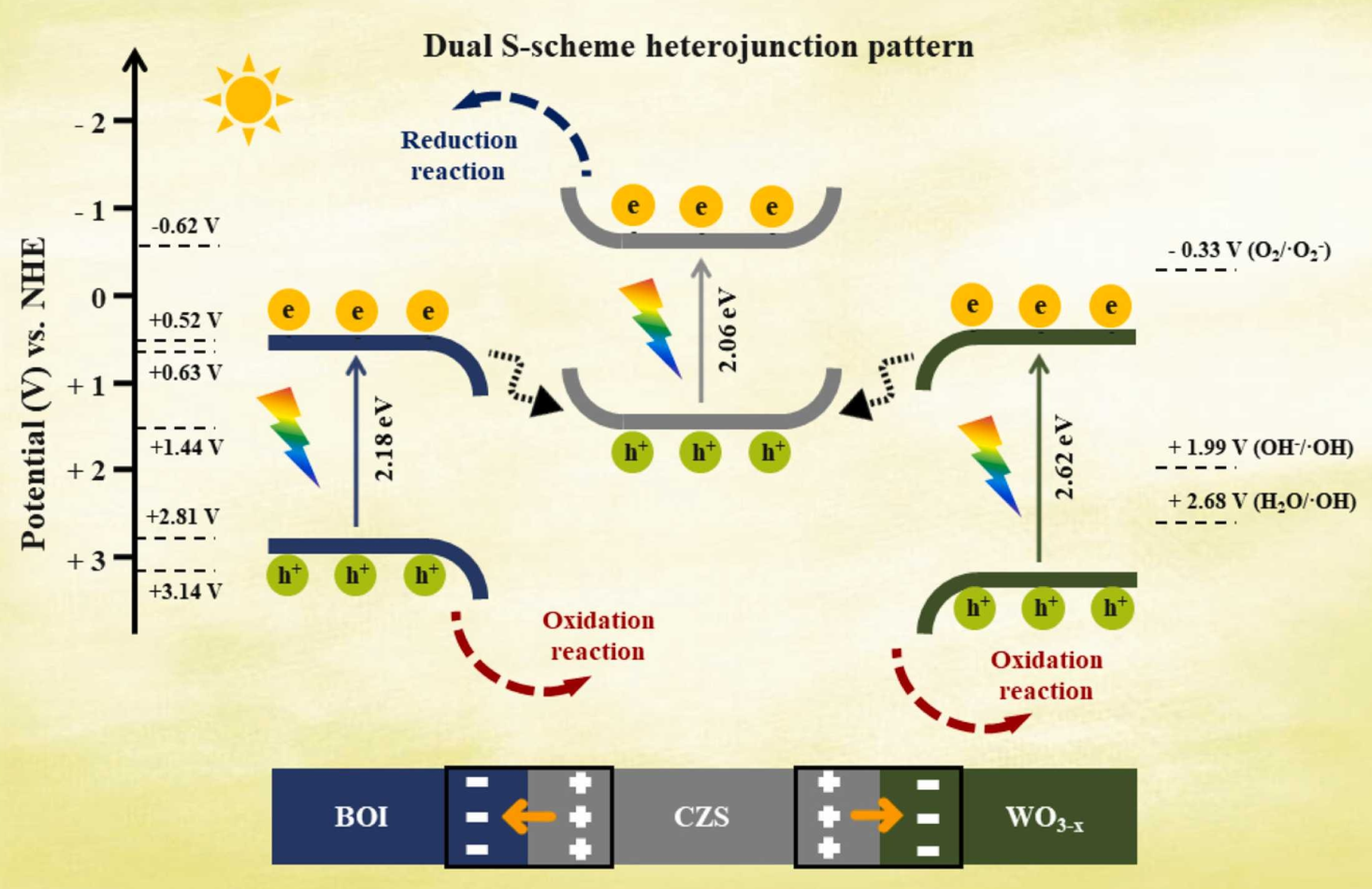 工业废水中苯酚的自然降解速度缓慢,排放到环境中对人类的生存和发展以及整个生物圈都造成了干扰和威胁。研究论文“A novel double S-scheme photocatalyst Bi7O9I3/Cd0.5Zn0.5S QDs/WO3-x with efficient full-spectrum-induced phenol photodegradation”主要内容包括:制备了具有全光谱响应的Bi7O9I3/Cd0.5Zn0.5SQDs/WO3-x(BCW)三元异质结,对苯酚的降解效率达到了100%。其中,Cd0.5Zn0.5S QDs是还原型光催化剂,而Bi7O9I3和WO3-x是氧化型光催化剂,可协同形成活性氧。WO3-x作为光敏剂还可以改善复合材料的光响应范围。此外,三种半导体之间形成的多通道传输路径有利于光生载流子的迁移和空间分离。因此BCW复合材料在全光谱、可见光和近红外光均表现出良好的苯酚降解性能。该ESI高被引论文的链接为:https://doi.org/10.1016/j.apcatb.2022.121839