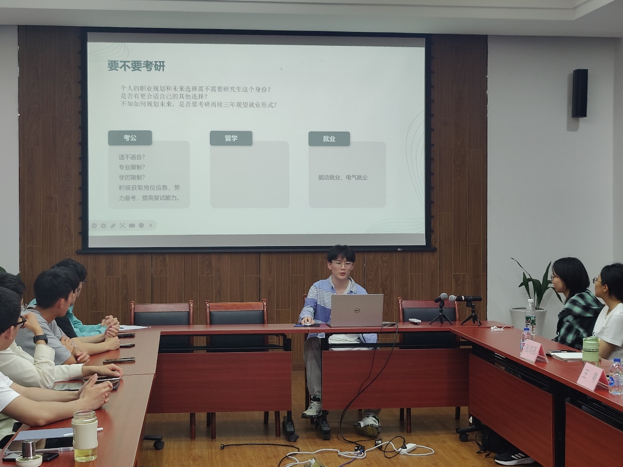成功上岸中国科学技术大学的吴庆贤则以“是否要考研”问题为引,从自身职业生涯规划出发对考研、考公、留学、就业等各类毕业去向进行了分析,并介绍了不同专业就业方向对于学历的要求以及相关待遇,引导同学们结合自身实际情况选择报考院校及专业。