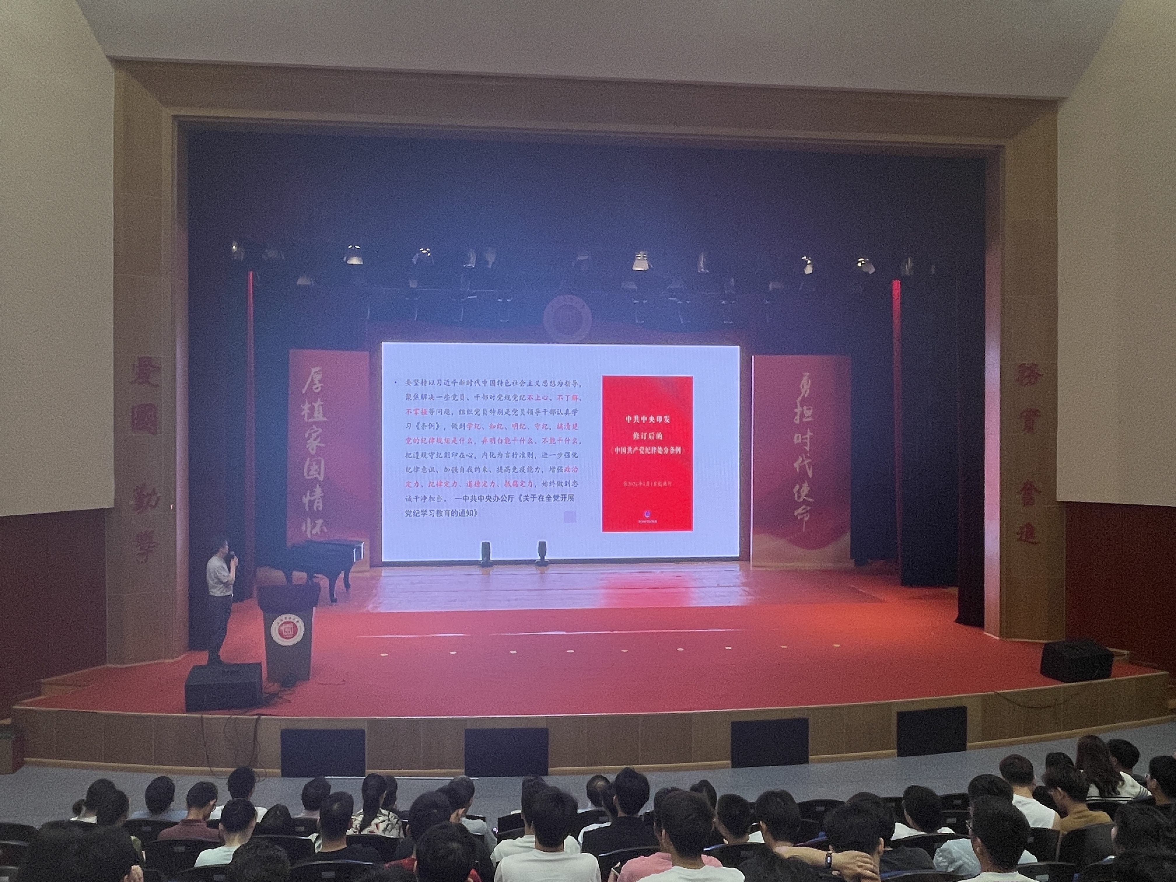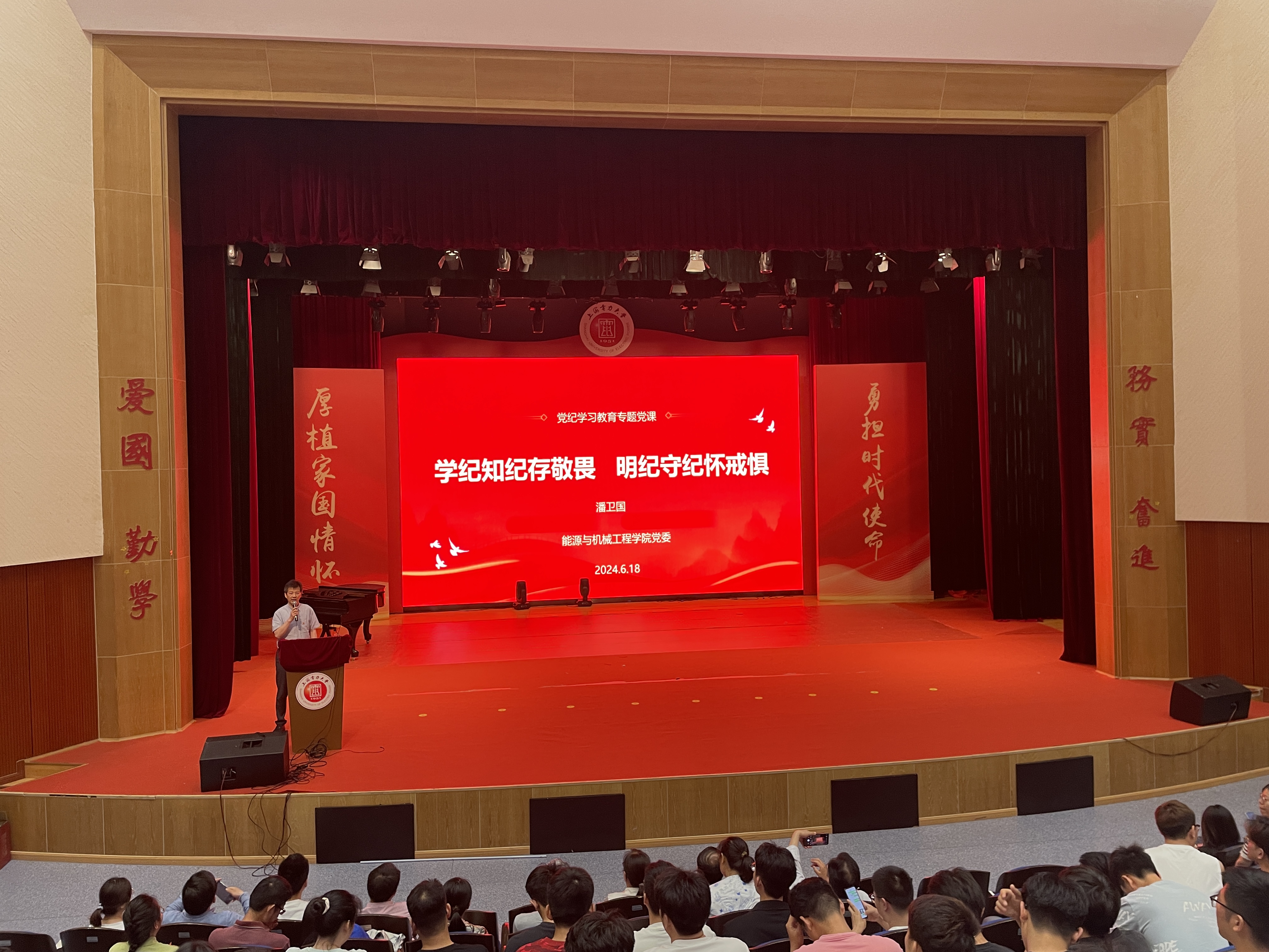 6月18日,beat365中文官方网站党委书记潘卫国以“学纪知纪存敬畏 明纪守纪怀戒惧”为主题,讲授党纪学习教育专题党课,beat365中文官方网站全体师生党员参加学习。