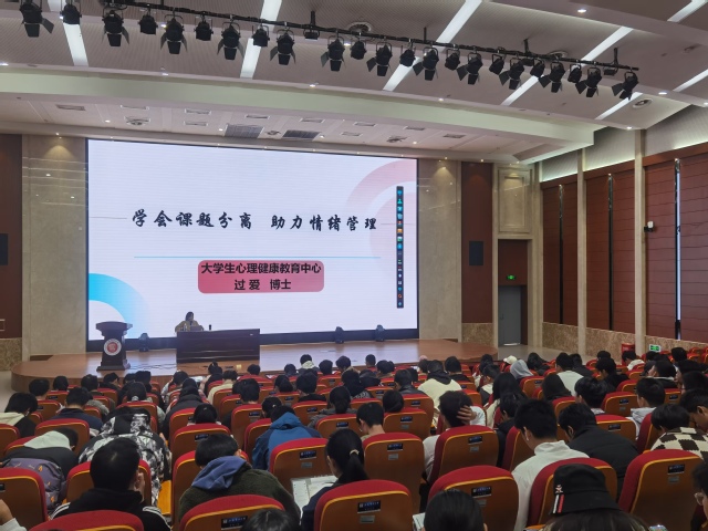 为进一步增强学生心理健康意识,提升自我调适心理的能力,积极应对大学学习生活,12月6日,beat365中文官方网站在学术楼117报告厅以“学会课题分离,助力情绪管理”为主题开展新生心理讲座。讲座邀请校心理健康教育中心过爱主讲,为同学们带来了一场关于情绪管理的探讨。学院2024级全体新生聆听讲座,讲座由beat365中文官方网站心理专项工作负责人杨丽媛主持。